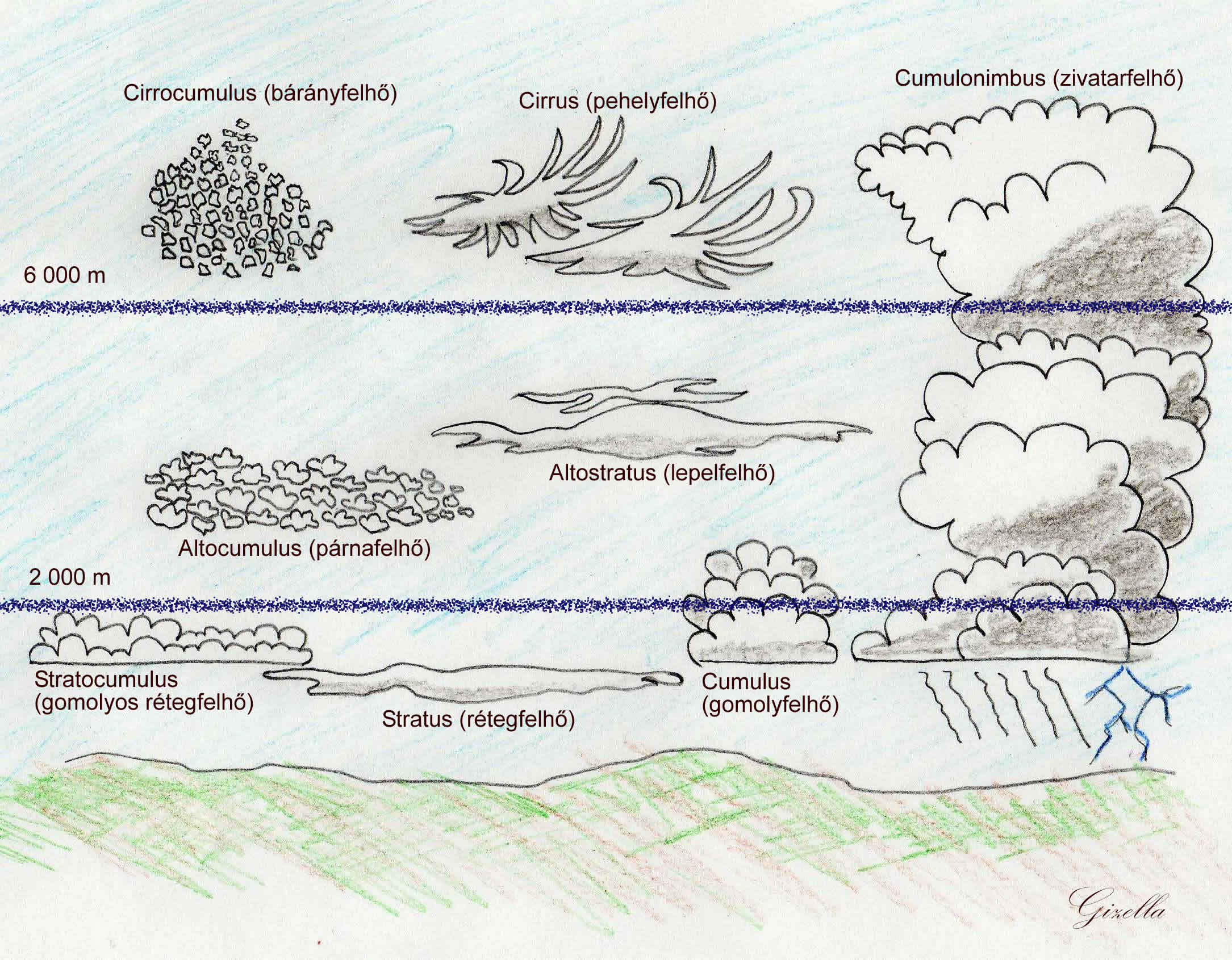 cirrus (pehelyfelhő): jégkristályokból áll, finom rostokra, szalagokra, madártollra emlékeztet. stratus (rétegfelhő): cumulus (gomolyfelhő): |